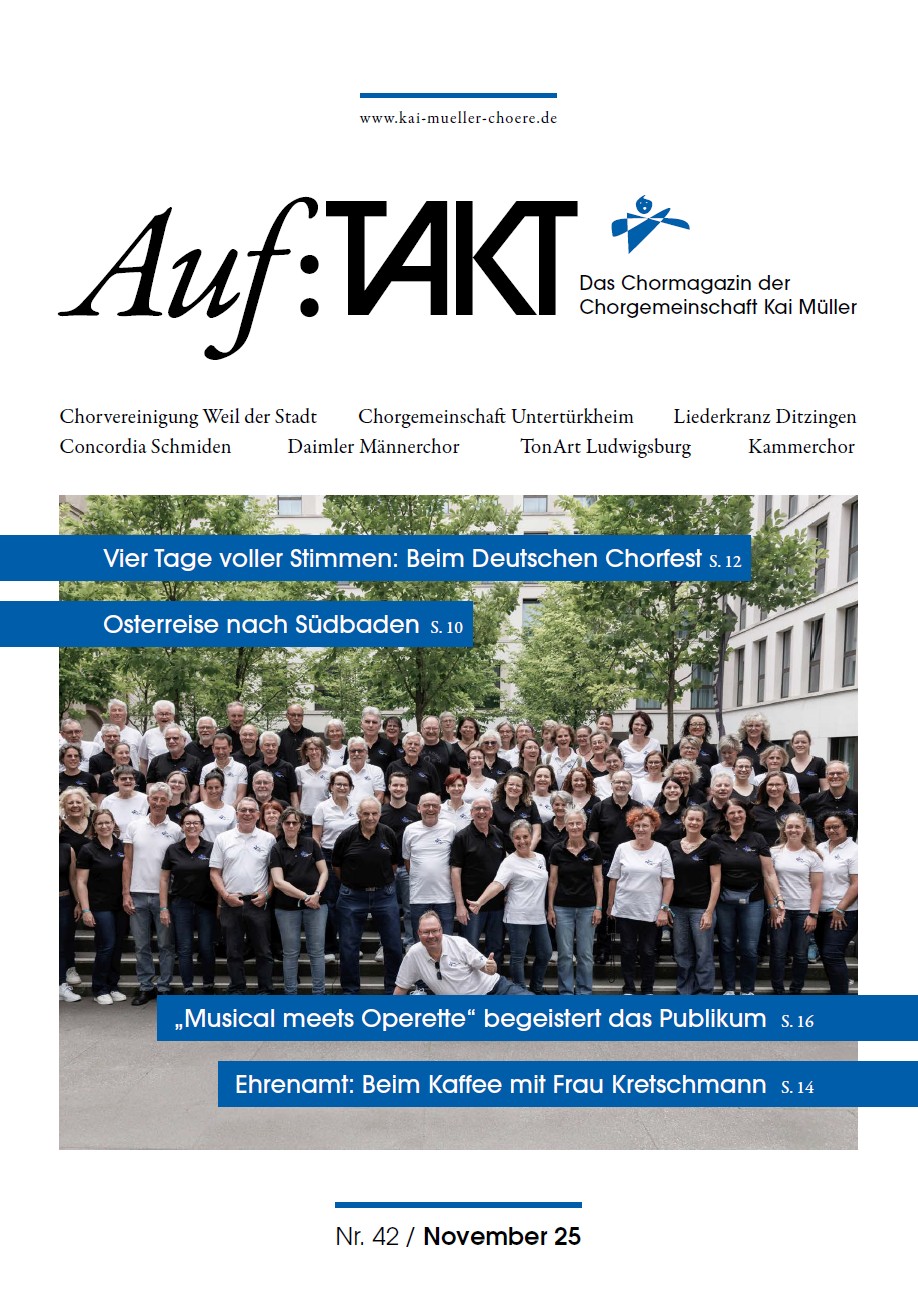Die neue Ausgabe des Chormagazins AUFTAKT ist wieder vollbepackt mit interessanten Geschichten rund um die Vereine der Chorgemeinschaft Kai Müller.